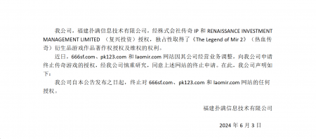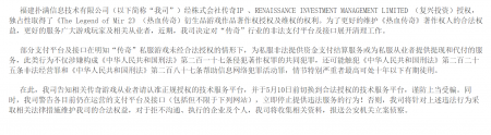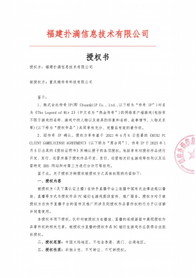 福建撲滿信息技術有限公司注冊地位于福建省福州市,是國內《熱血傳奇》客戶端游戲獨占性版權人。對《熱血傳奇》客戶端游戲擁有全部版權,并有權基于版權權利進行該游戲維權。株式會社傳奇IP (以下簡稱傳奇IP )對《The Legend of Mir 2》(中文名為“熱血傳奇"、或“傳奇”、“傳奇2”、“MIR II”)游戲(以下稱為 “授權作品”) 共同享有充分、完整且有效的著作權。經傳奇IP授權 , RENAISSANCE INVESTMENT MANAGEMENT LIMITED (以下簡稱 RENAISSANCE Ltd.)有權在中國大陸地區(qū)獨占性地對授權作品的網(wǎng)絡客戶端游戲進行開發(fā)、 發(fā)行、管理、宣傳、推廣和運營,針對授權作品的侵權游戲及侵權方,RENAISSANCE Ltd.有權采取必要的措施,并有權將前述權利分授權給第三人。福建撲滿信息技術有限公司經RENAISSANCE Ltd.授權,獲得上述權利,有權在中國大陸地區(qū)獨占性地對授權作品的網(wǎng)絡客戶端游戲進行開發(fā)、發(fā)行、管理、宣傳、推廣和運營,并有權對侵權行為/主體采取維權措施。
